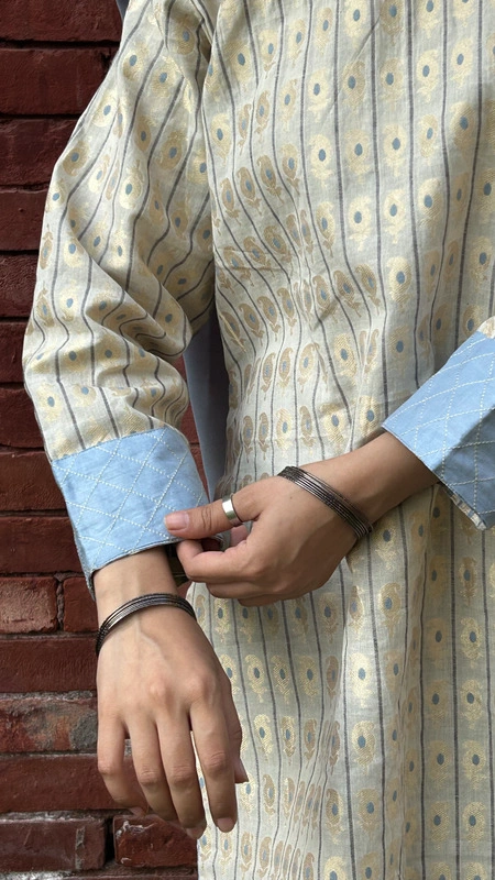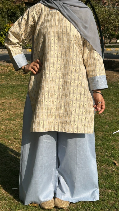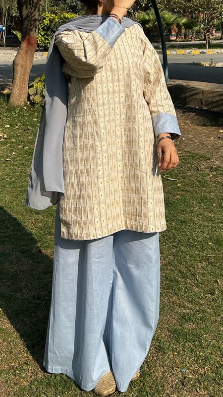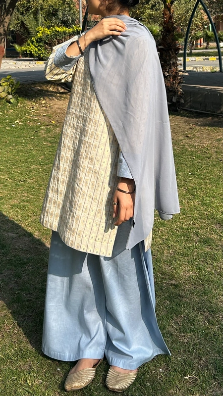 Crafted from luxe jacquard in a soft skin beige tone, this set feels light, refined, and effortlessly graceful. The delicate blue palazzo adds a refreshing contrast — airy, flowy, and made to move with you. The subtle woven texture of the shirt brings depth and quiet elegance, giving a timeless yet modern feel.