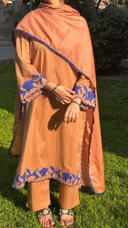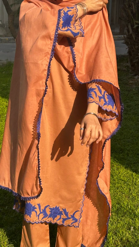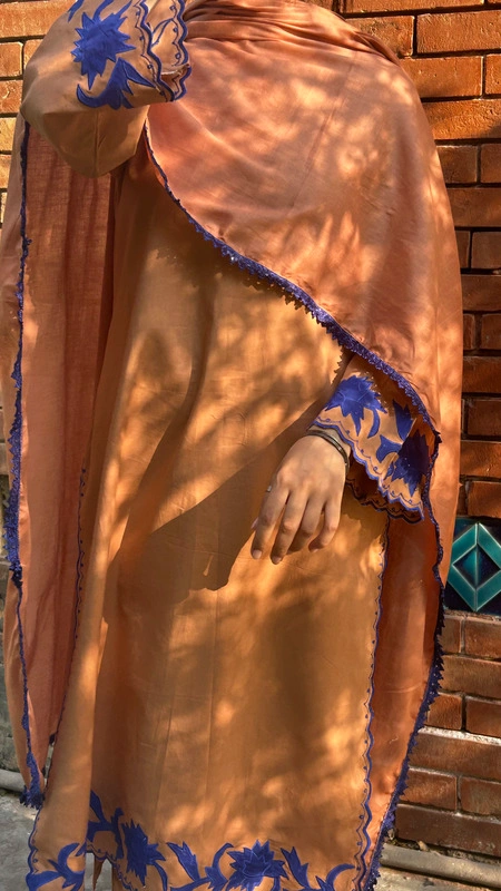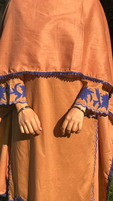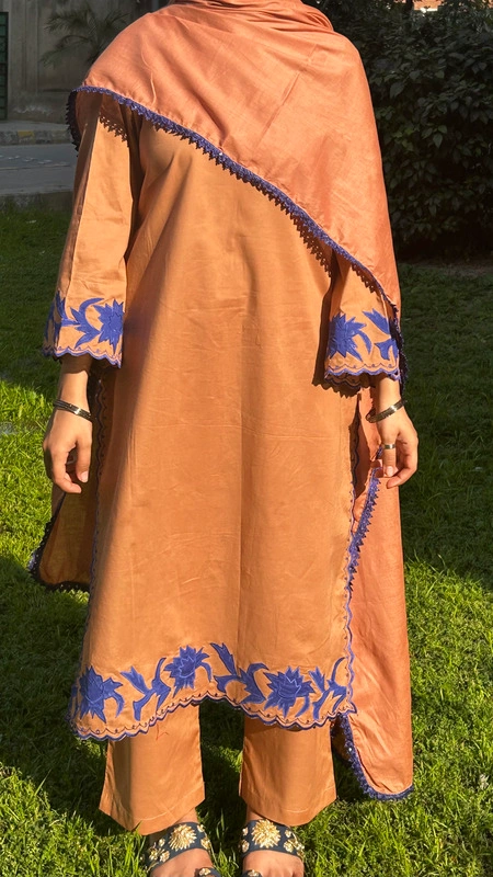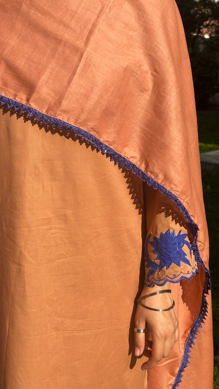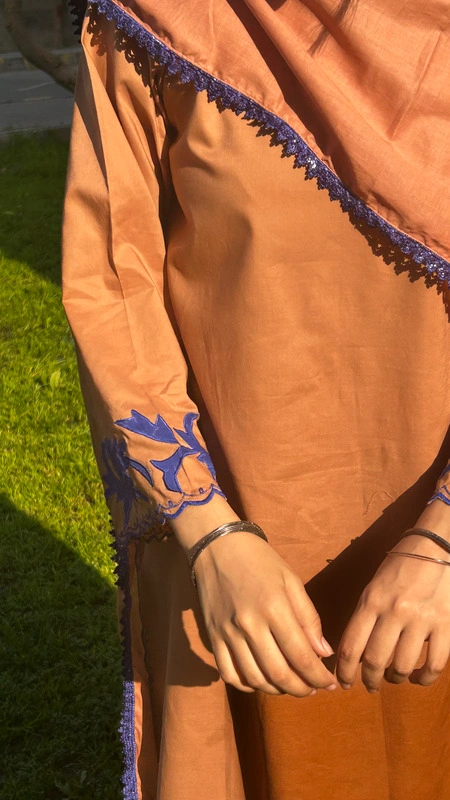 A rich Tobacco Brown that feels warm, grounded, and quietly powerful like late golden evenings before Eid. The warm tobacco brown tone brings depth and quiet confidence, while intricate blue lace and delicate appliqué work on the hem and sleeves add refined contrast. Subtle blue cutwork along the side hem and sleeve edges creates movement and detail that softly stands out. Every element is thoughtfully placed to make you feel graceful yet strong, minimal yet memorable